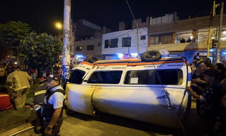 El impacto fue tan violento que la combi terminó con las llantas hacia arriba sobre la berma central de la avenida. “Ahí se ha volteado con las llantas para arriba. (…) La gente comentaba que sí, lo llevaron a seis personas heridas y uno fallecido, dicen”, agregó la vecina, quien presenció los momentos posteriores al accidente.